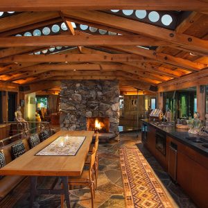 The architecture leaves no ambiguity as to why. The 3,635 square-foot residence’s core is anchored by a structure made up of four massive angled two-story concrete pillars that rise from the ultra-thick concrete floor between them, appearing to be a sculpture as much as it is a geotechnical marvel. Towering walls of glass enclose a living room with a stone fireplace within this giant structure, which supports an open loft floor along the perimeter of the open space. It is here that one finds an intimate space with a glass ceiling and the best viewing of the glass geometric pyramid in the ceiling’s center.